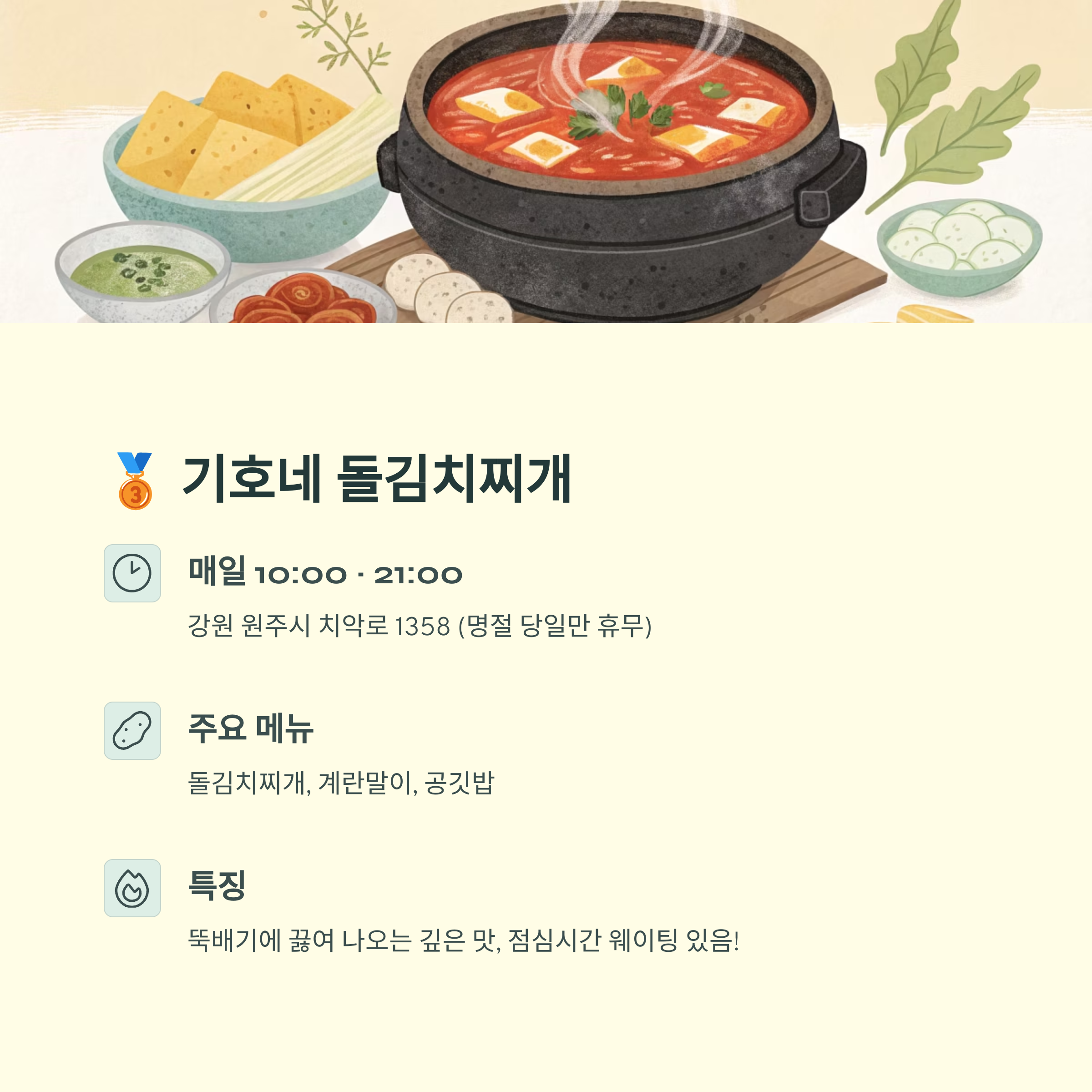 - 💡 특징: 다양한 순두부 종류를 갖춘 원주 대표 순두부 전문점. 속 든든한 아침/해장/야식까지 전천후 맛집!