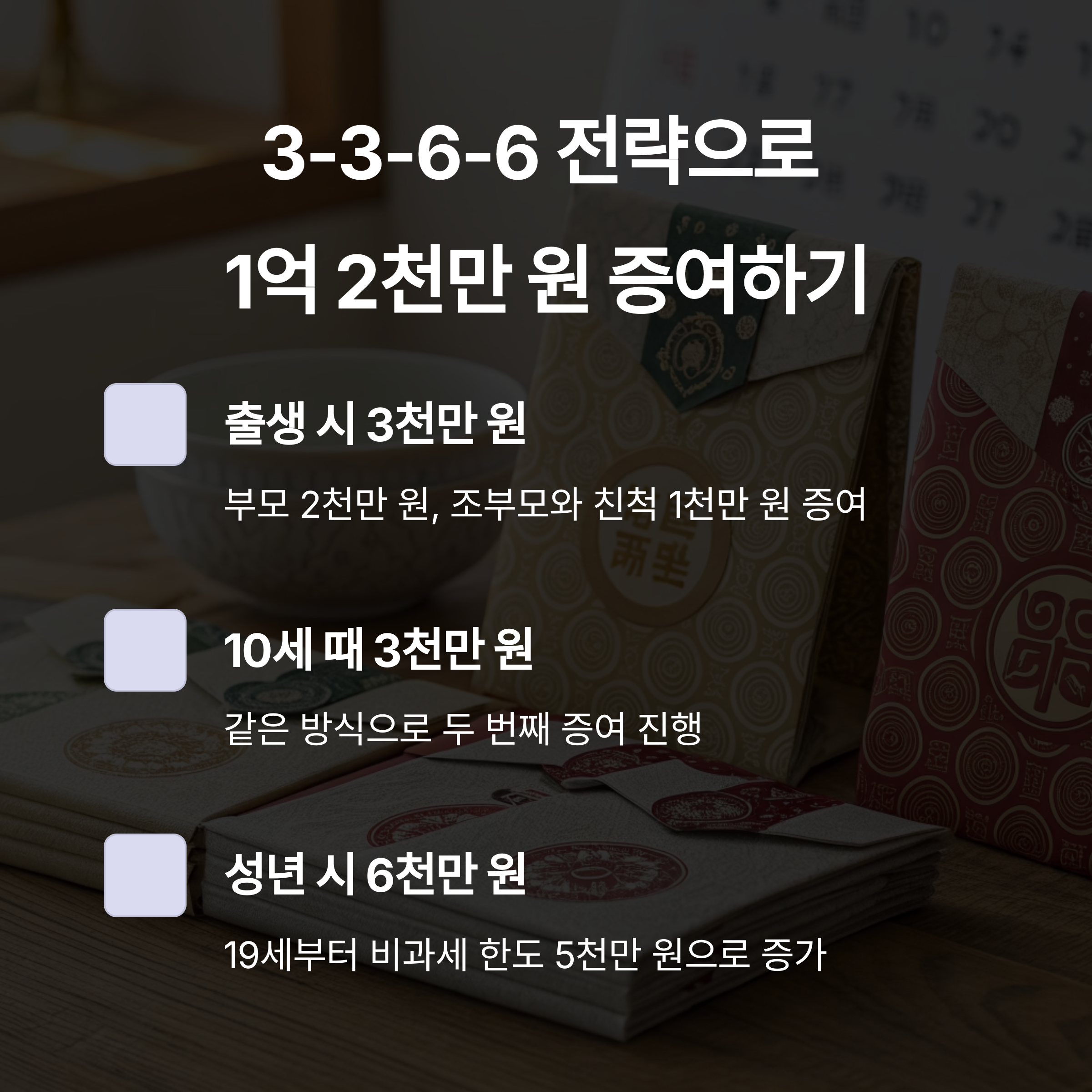 ‘3-3-6-6 방법’은 자녀가 태어났을 때부터 계획적으로 증여를 시작하는 방식입니다.
