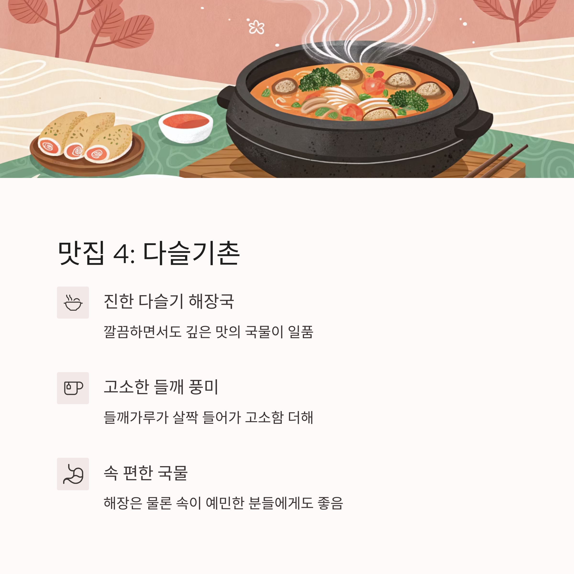 맷돌로 직접 간 콩으로 만든 순두부는 부드럽고 고소합니다. 얼큰한 국물에 담긴 순두부찌개는 속을 풀기에 제격이며, 기본 반찬 구성도 깔끔하고 정갈합니다. 아침에 문을 열어 숙박 후 첫 끼로 찾는 분들이 많습니다.