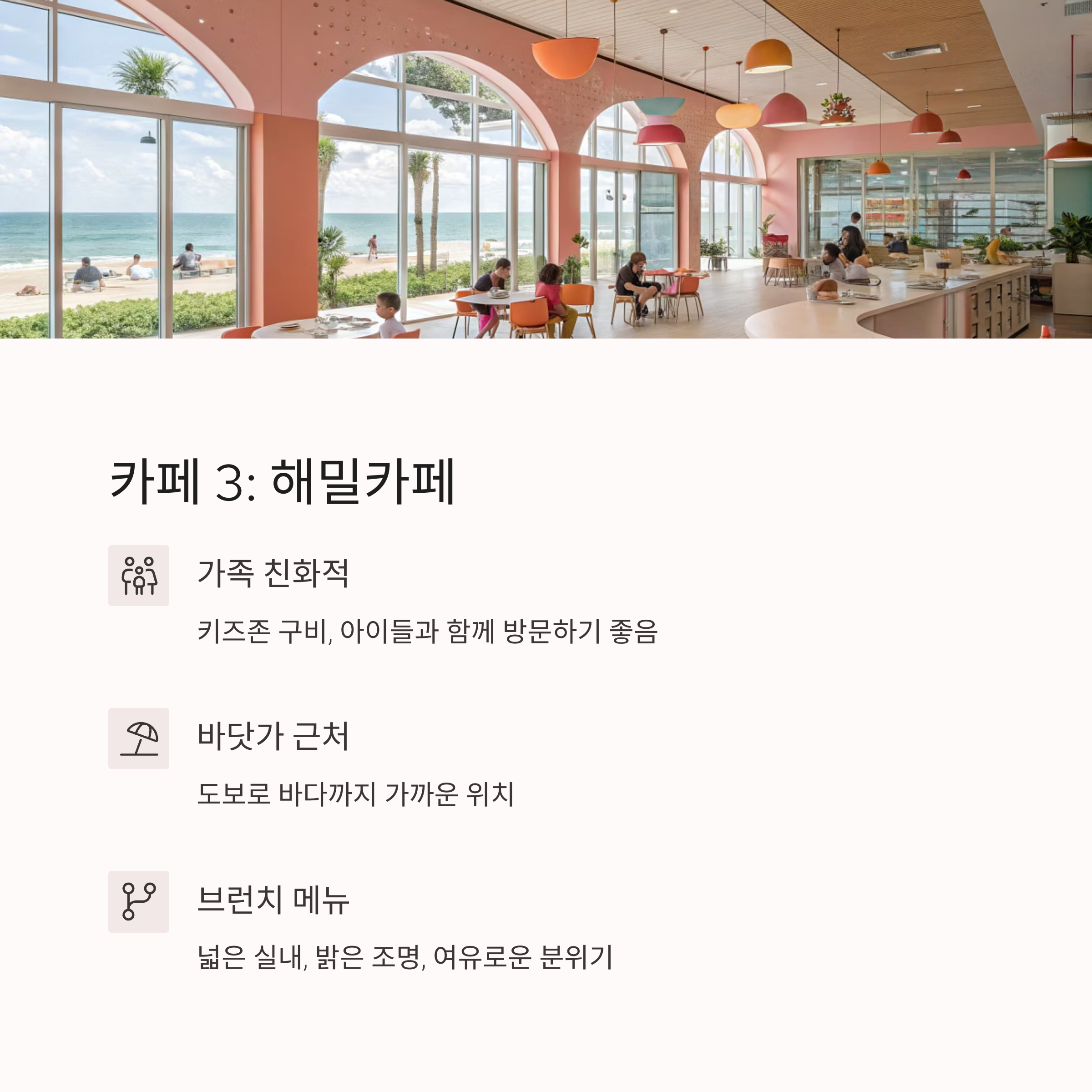 바닷가에서 도보로 가까운 이 카페는 키즈존이 따로 마련돼 있어 아이들과 함께 오기 좋습니다. 넓은 실내와 밝은 조명, 여유로운 분위기 덕분에 대화가 많은 모임에도 적합합니다. 브런치 메뉴도 준비돼 있습니다.