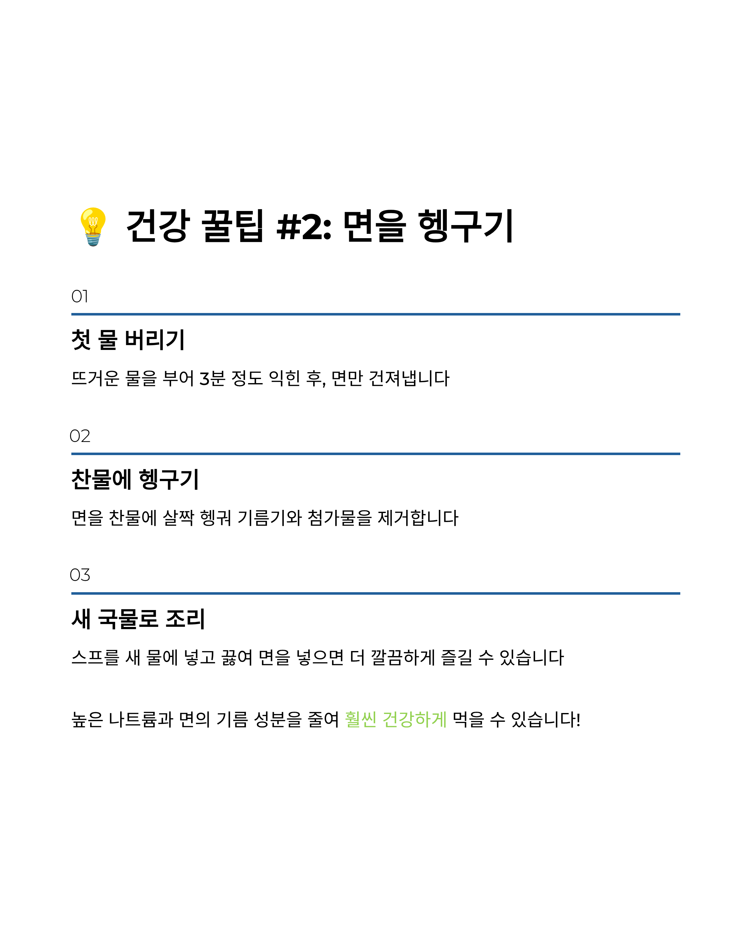 - 새 국물: 스프를 새 물에 넣고 끓여 면을 넣어 먹으면, 면에 배어있던 기름기와 첨가물 일부가 제거되어 더 깔끔하고 건강하게 즐길 수 있습니다.