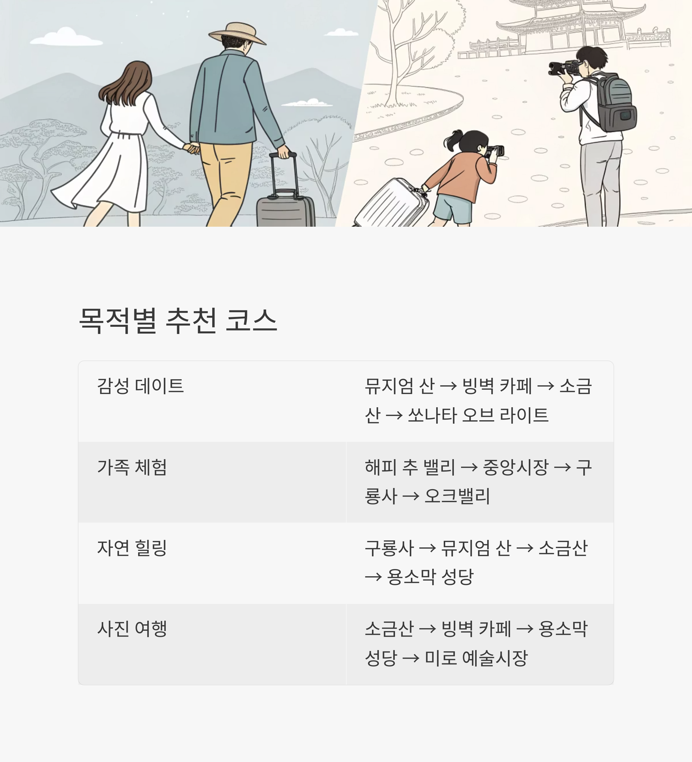 📝 여행 목적별 추천 코스 정리 여행 목적 추천 코스 구성 감성 데이트 뮤지엄 산 → 빙벽 카페 → 소금산 그랜드밸리 → 쏘나타 오브 라이트 가족 체험 여행 해피 추 밸리 → 원주 중앙시장 → 구룡사 → 오크밸리 리조트 자연 힐링 여행 구룡사 → 뮤지엄 산 → 소금산 → 용소막 성당 사진 여행 소금산 출렁다리 → 빙벽 카페 → 용소막 성당 → 미로 예술시장