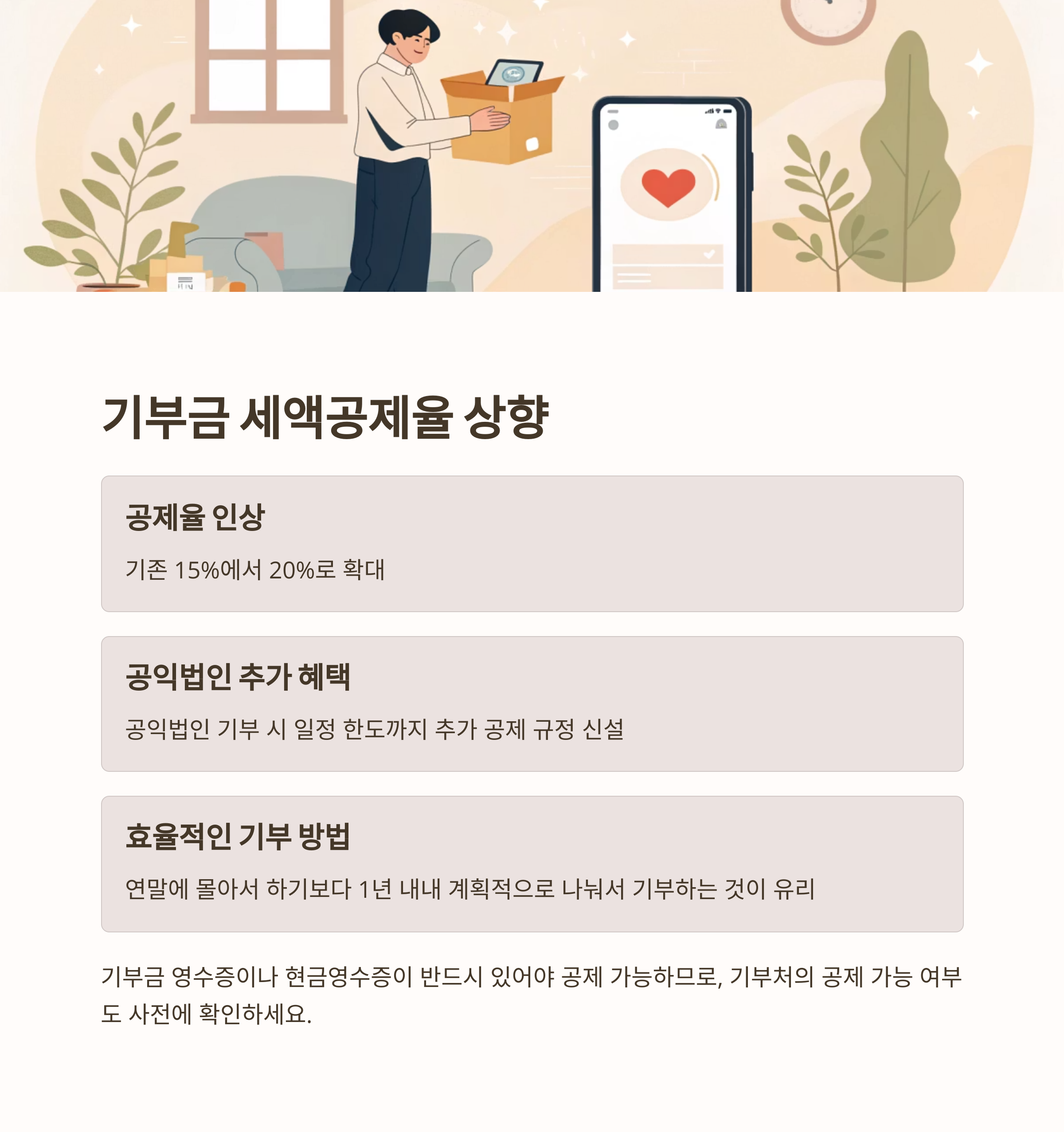 2025년에는 기부금 세액공제율도 15%에서 20%로 확대되며,