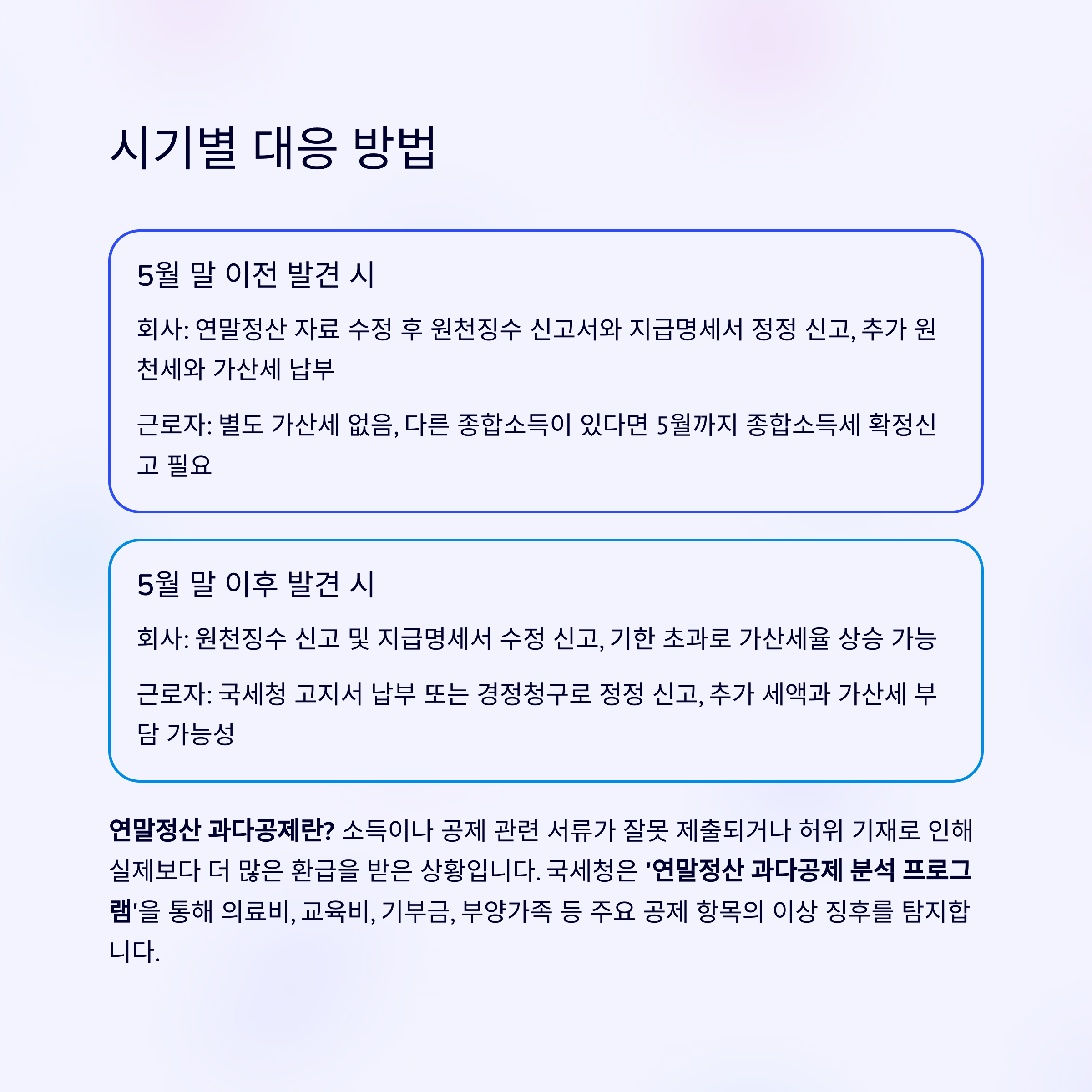 - 연말정산 후 과다공제 사실이 발견되면, 시기별로 회사와 근로자가 각각 조치해야 할 일이 다릅니다.