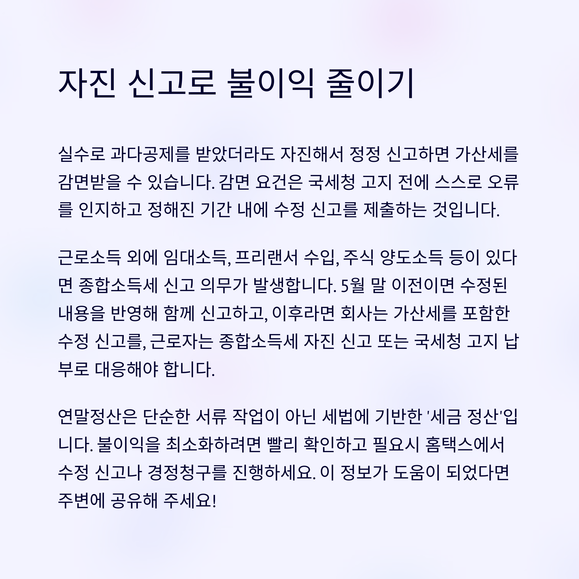 불이익을 줄이려면 빨리 확인하고, 필요한 경우 홈택스에서 수정 신고 또는 경정청구를 진행해야 합니다.
