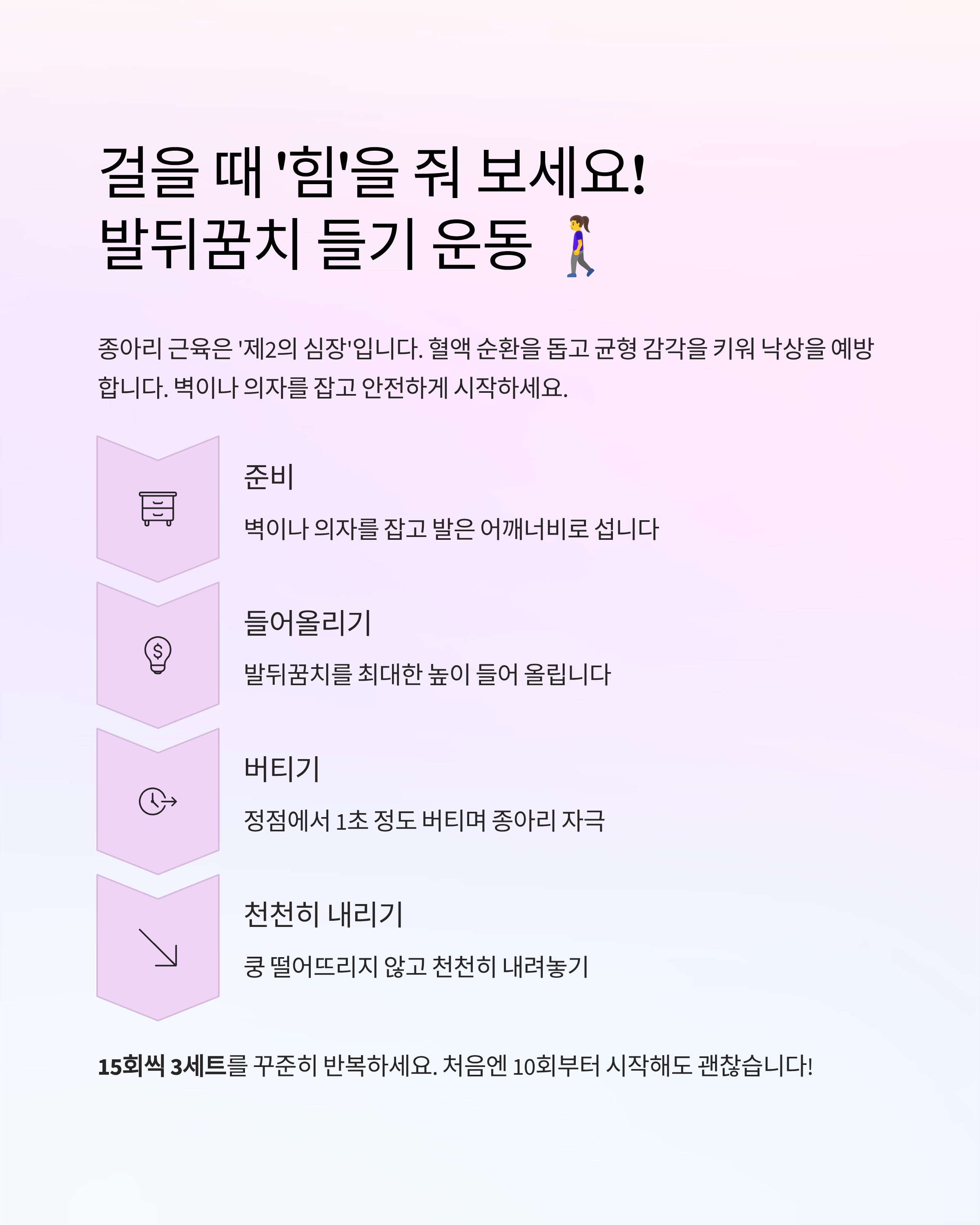 종아리 근육은 '제2의 심장'입니다. 혈액 순환을 돕고 균형 감각을 키워 낙상을 예방합니다.