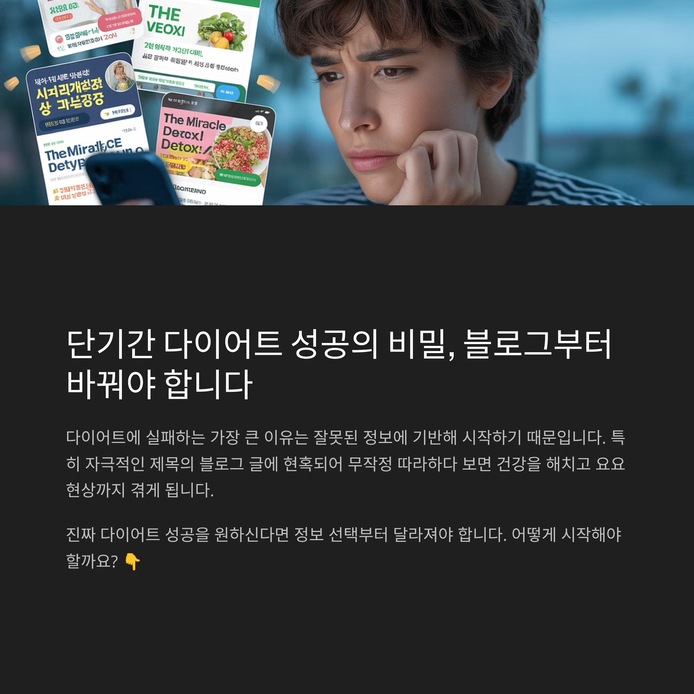 특히 블로그에서 자극적인 제목에 끌려 무작정 따라하다 보면, 건강을 해치고 요요현상까지 겪게 됩니다.