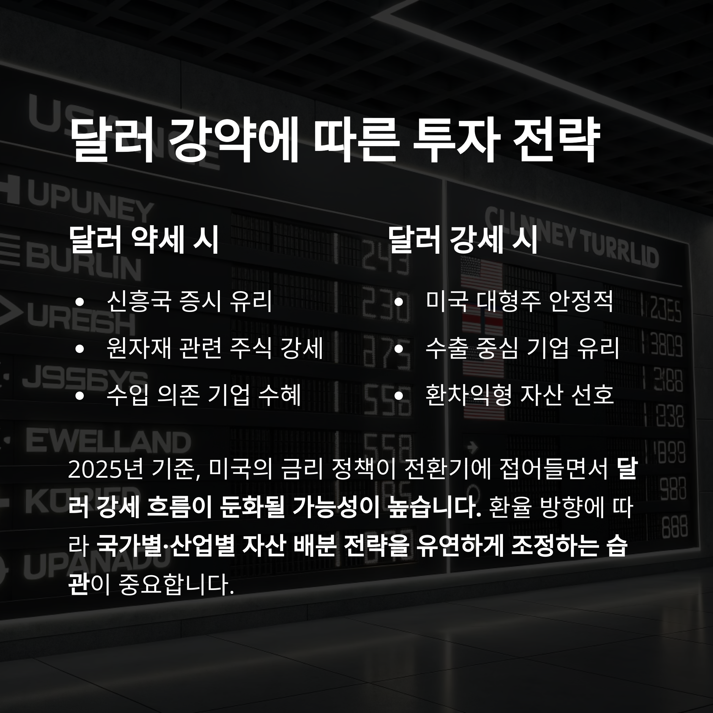 따라서 환율 방향에 따라 국가별·산업별 자산 배분 전략을 유연하게 조정하는 습관이 중요합니다.