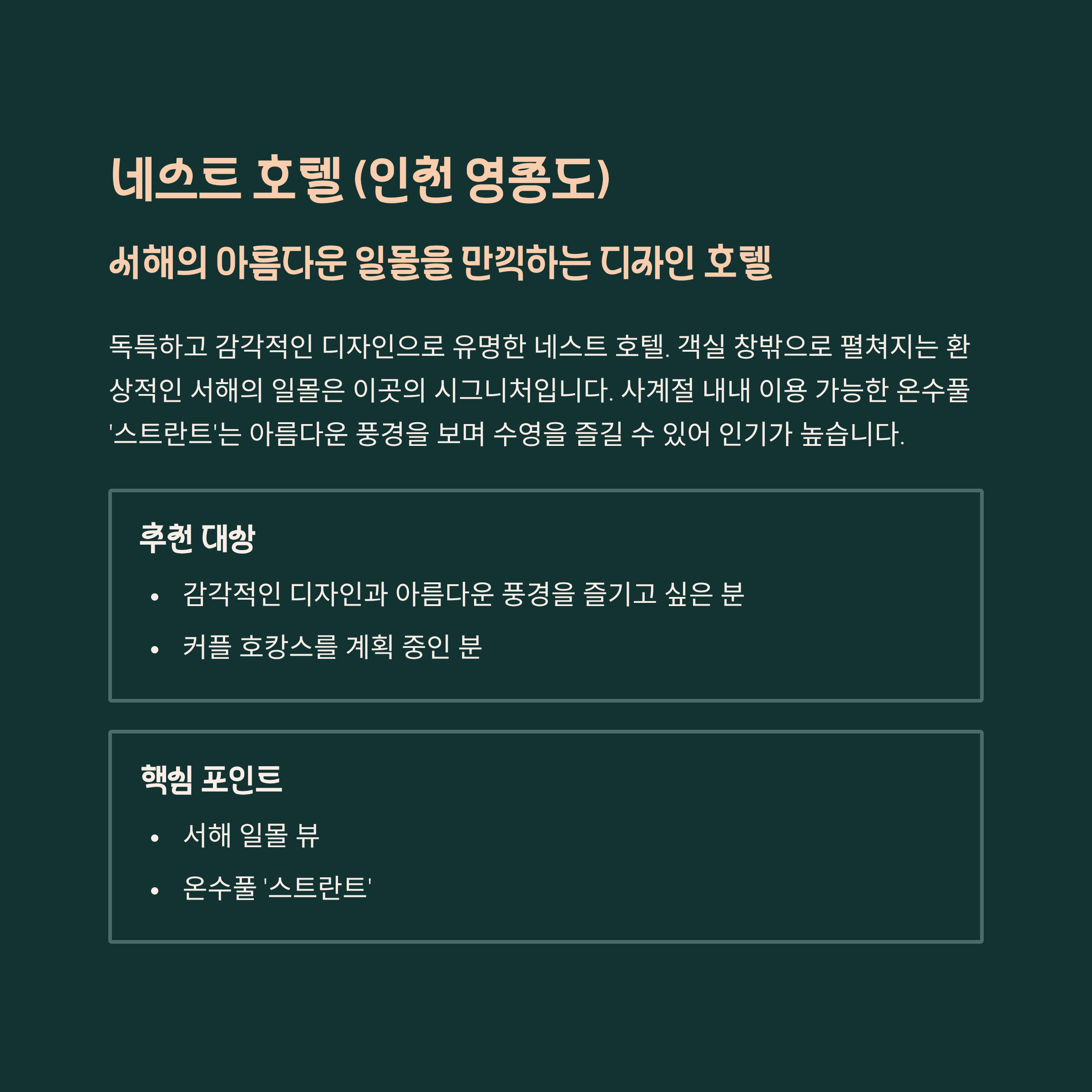 - 추천 대상: 감각적인 디자인과 아름다운 풍경을 즐기고 싶은 분, 커플 호캉스를 계획 중인 분