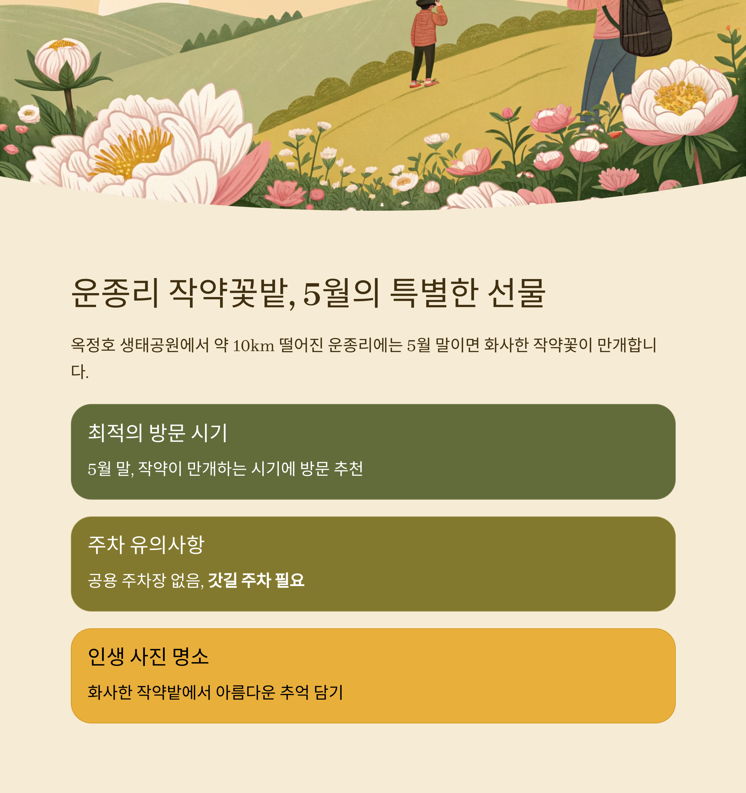 5월 말쯤 방문하면 화사한 작약의 매력을 한껏 느낄 수 있으며, 인생 사진 명소로도 유명합니다.