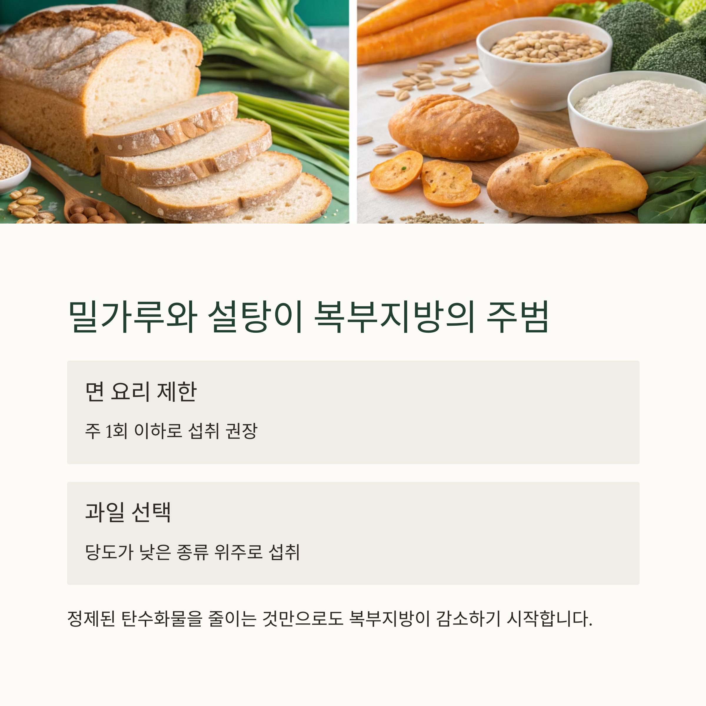 특히 밀가루 음식과 설탕이 많이 들어간 간식은 복부지방을 빠르게 증가시킵니다.