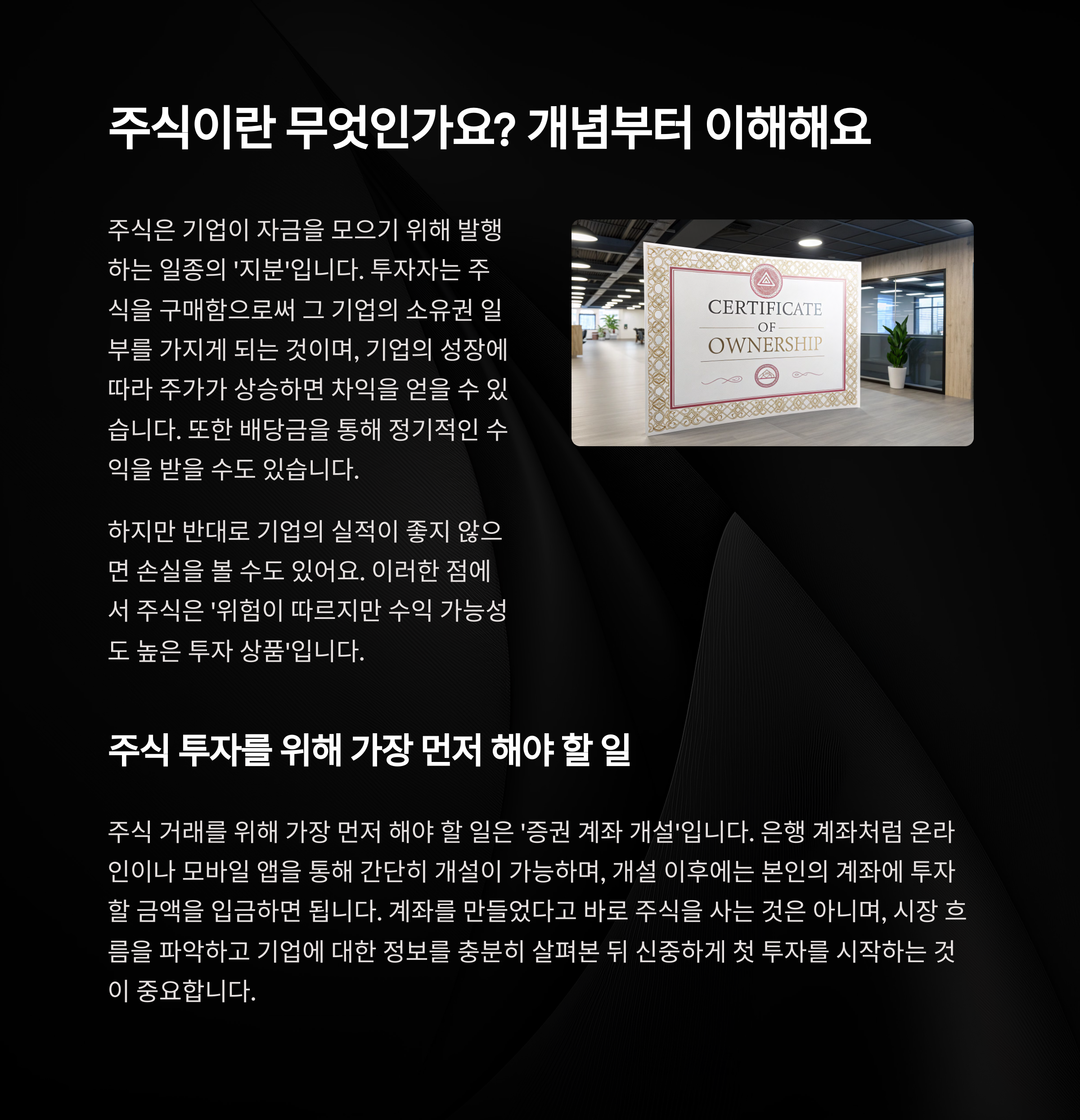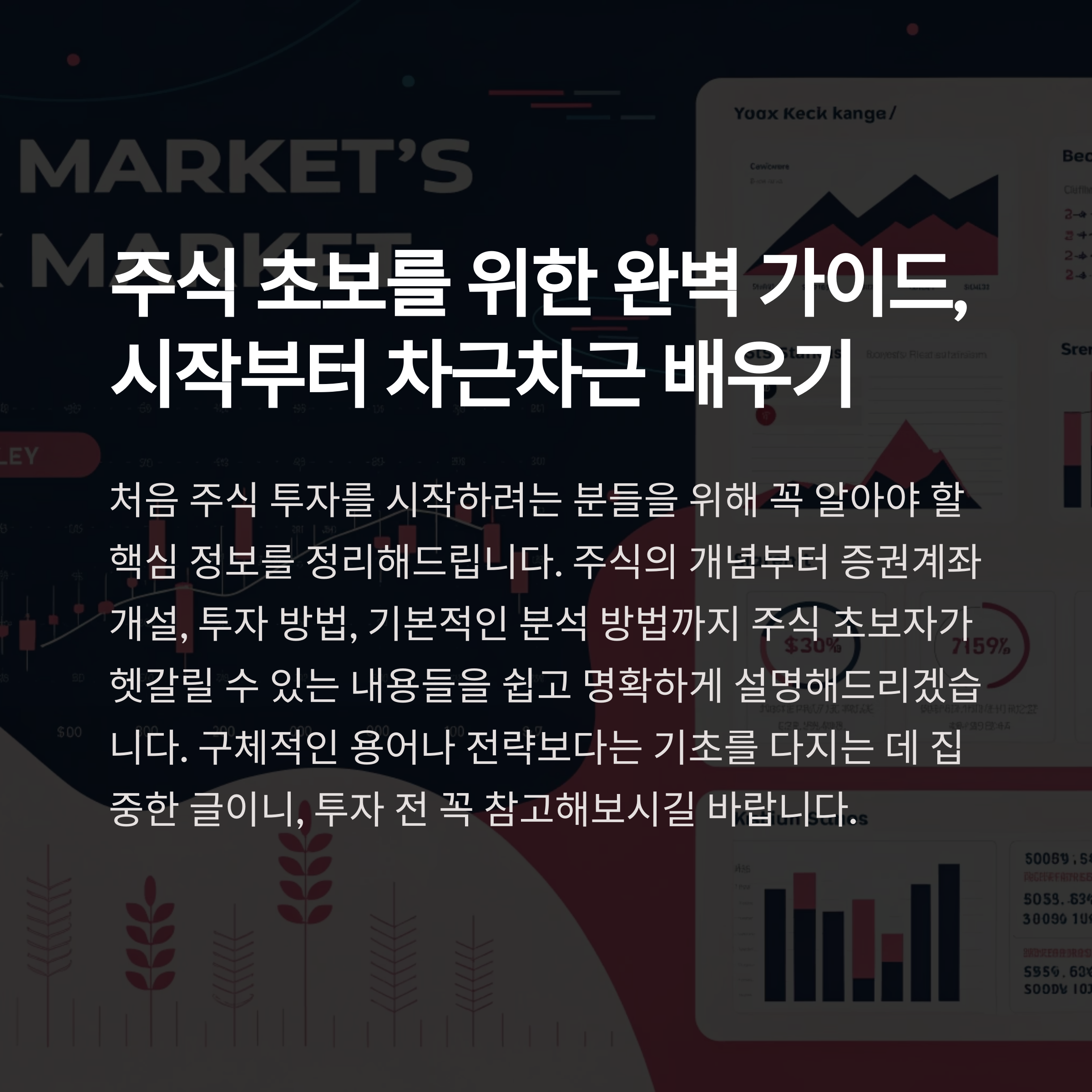 처음 주식 투자를 시작하려는 분들을 위해 꼭 알아야 할 핵심 정보를 정리해드립니다. 주식의 개념부터 증권계좌 개설, 투자 방법, 기본적인 분석 방법까지 주식 초보자가 헷갈릴 수 있는 내용들을 쉽고 명확하게 설명해드리겠습니다. 구체적인 용어나 전략보다는 기초를 다지는 데 집중한 글이니, 투자 전 꼭 참고해보시길 바랍니다.