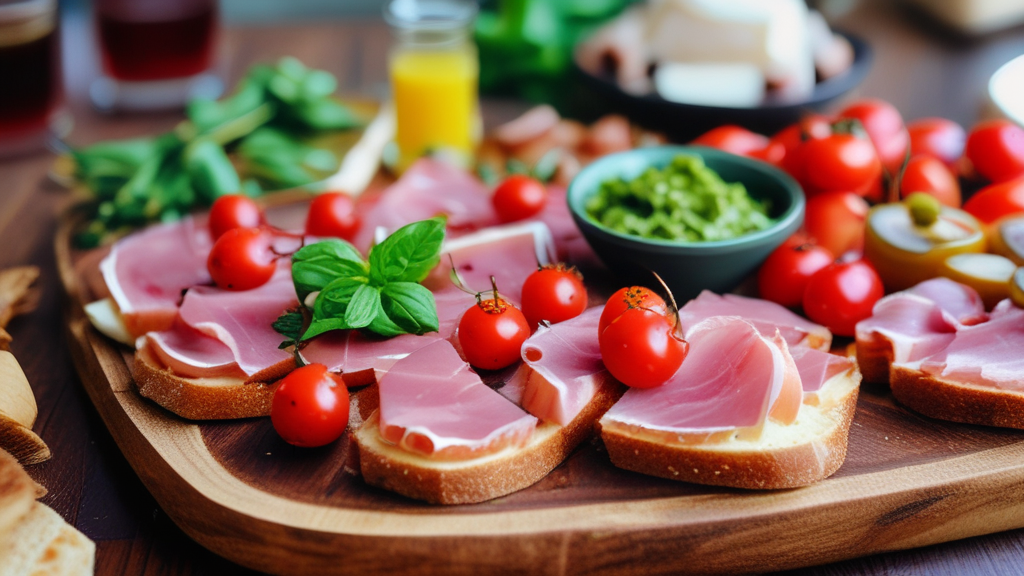 - 브루스케타: 구운 바게트에 페스토를 바르고 프로슈토 햄, 방울토마토, 파마산 치즈, 발사믹 드레싱을 올려 만듭니다.