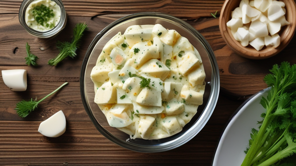 - 크래미는 잘게 자르고 그릭 요거트, 알룰로스, 식초와 섞어 소스를 만듭니다.