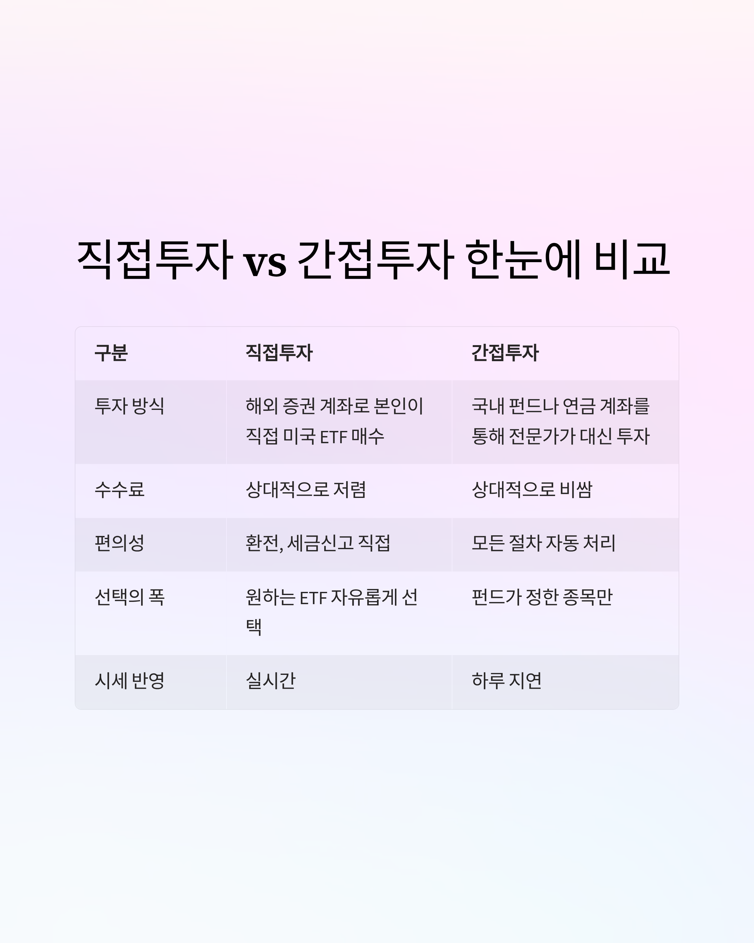 | 구분 | 직접투자 | 간접투자 |
