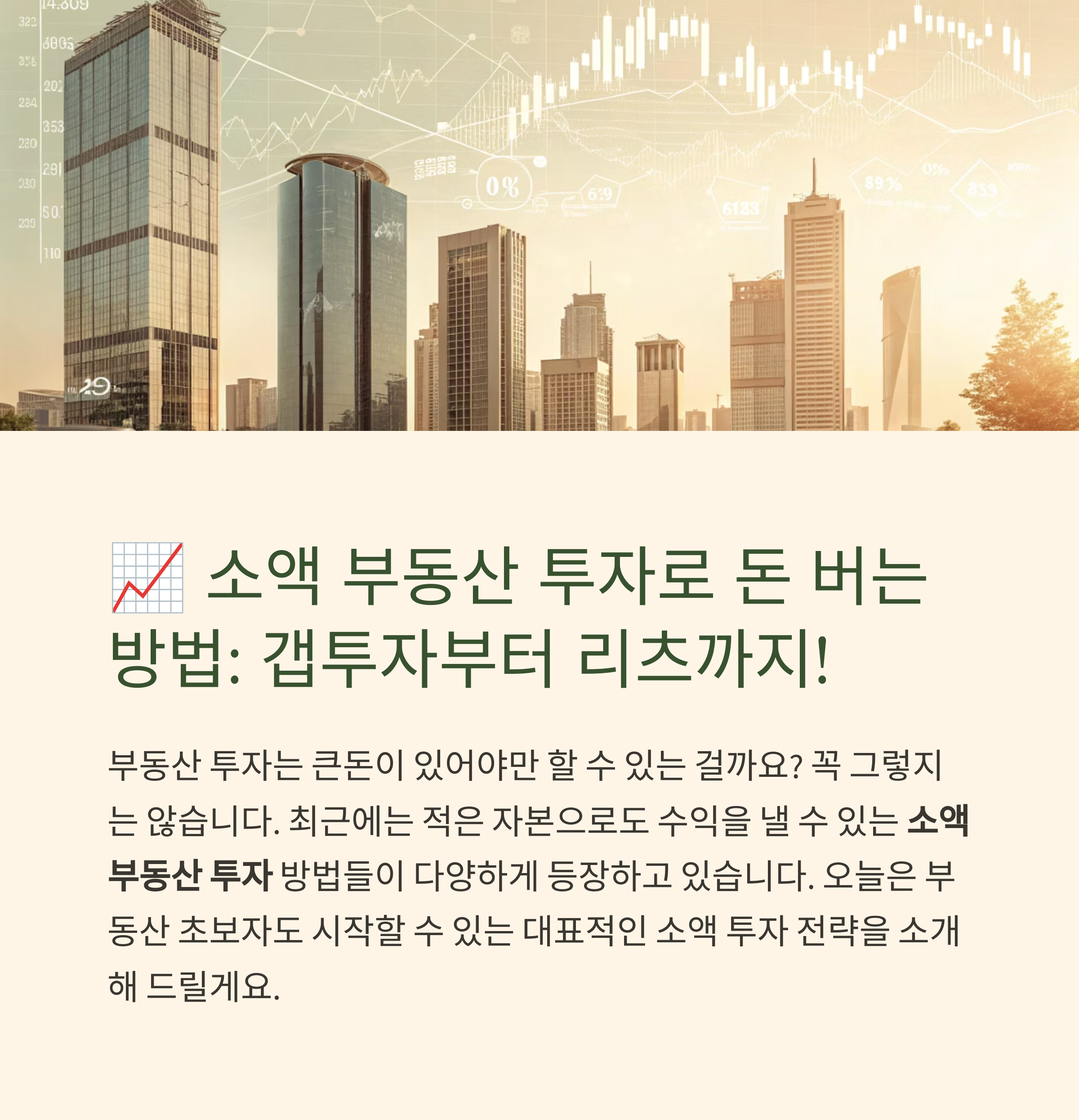 부동산 투자는 큰돈이 있어야만 할 수 있는 걸까요? 꼭 그렇지는 않습니다. 최근에는 적은 자본으로도 수익을 낼 수 있는 소액 부동산 투자 방법들이 다양하게 등장하고 있습니다. 오늘은 부동산 초보자도 시작할 수 있는 대표적인 소액 투자 전략을 소개해 드릴게요.