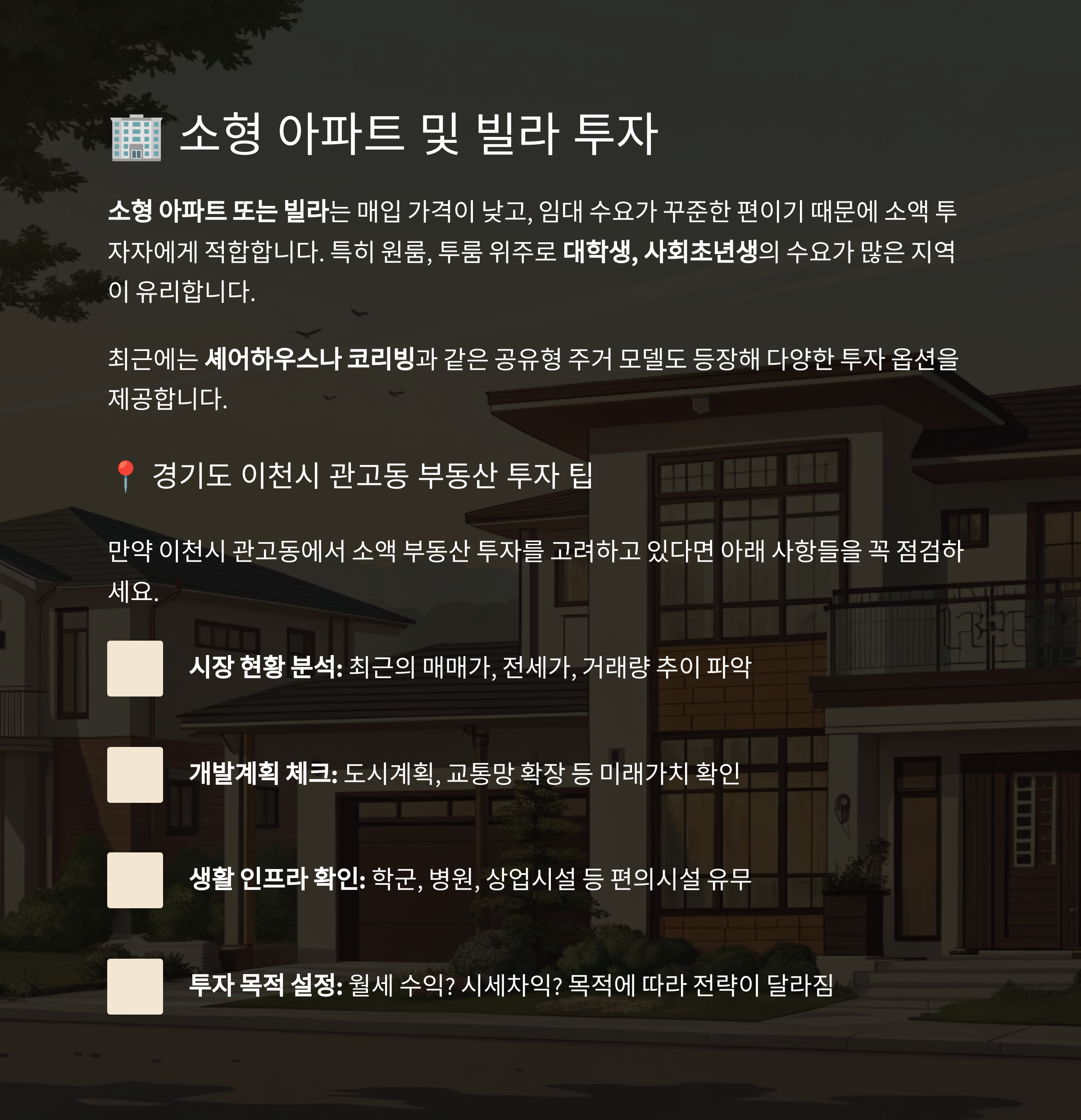 소형 아파트 또는 빌라는 매입 가격이 낮고, 임대 수요가 꾸준한 편이기 때문에 소액 투자자에게 적합합니다. 특히 원룸, 투룸 위주로 대학생, 사회초년생의 수요가 많은 지역이 유리합니다.