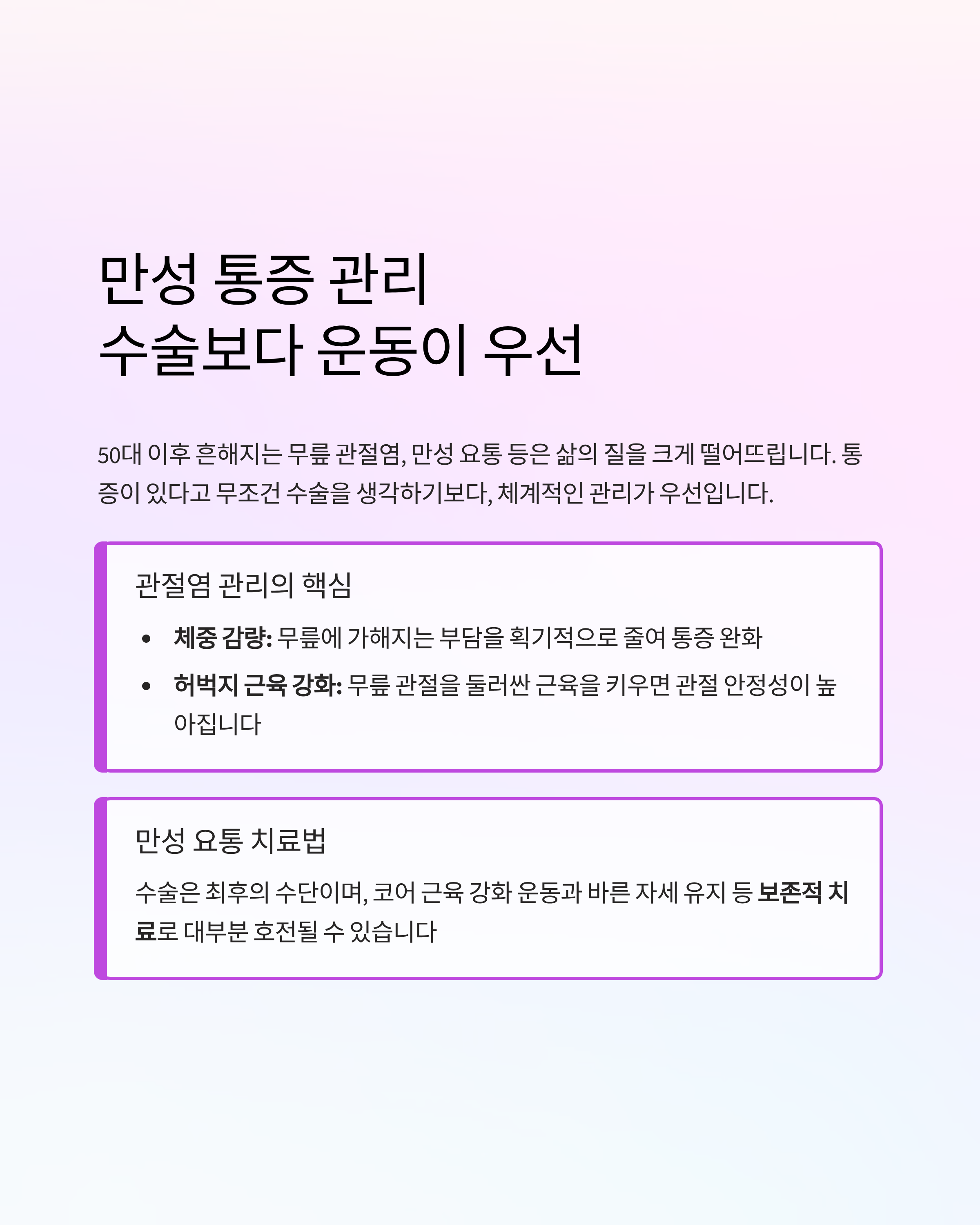 50대 이후 흔해지는 무릎 관절염, 만성 요통 등은 삶의 질을 크게 떨어뜨립니다. 통증이 있다고 무조건 수술을 생각하기보다, 체계적인 관리가 우선입니다.