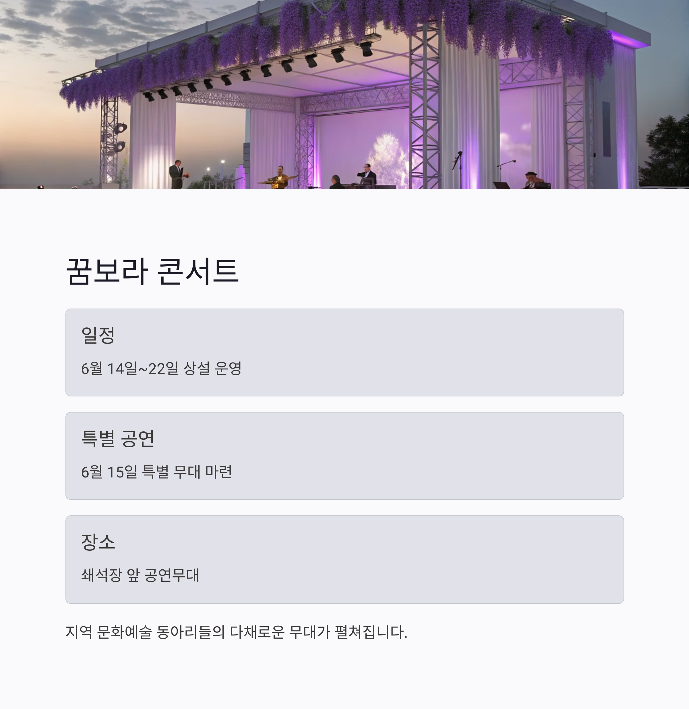 지역 문화예술 동아리들의 무대가 펼쳐지는 꿈보라 콘서트는 6월 14일부터 22일까지 상설 운영되며, 6월 15일에는 특별공연이 마련되어 더욱 풍성한 감동을 선사합니다.