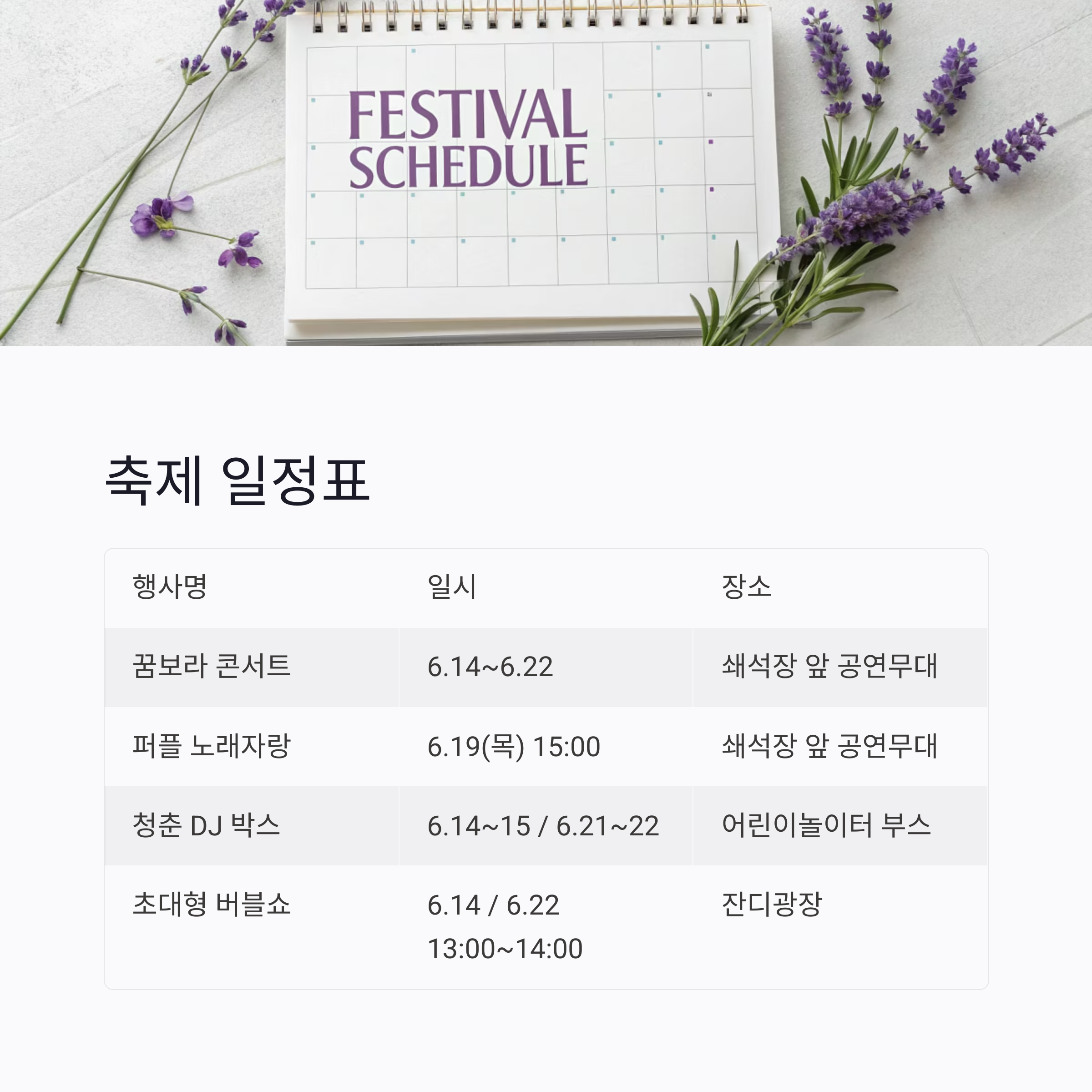 | 퍼플 노래자랑 | 6.19(목) 15:00~ | 쇄석장 앞 공연무대 |